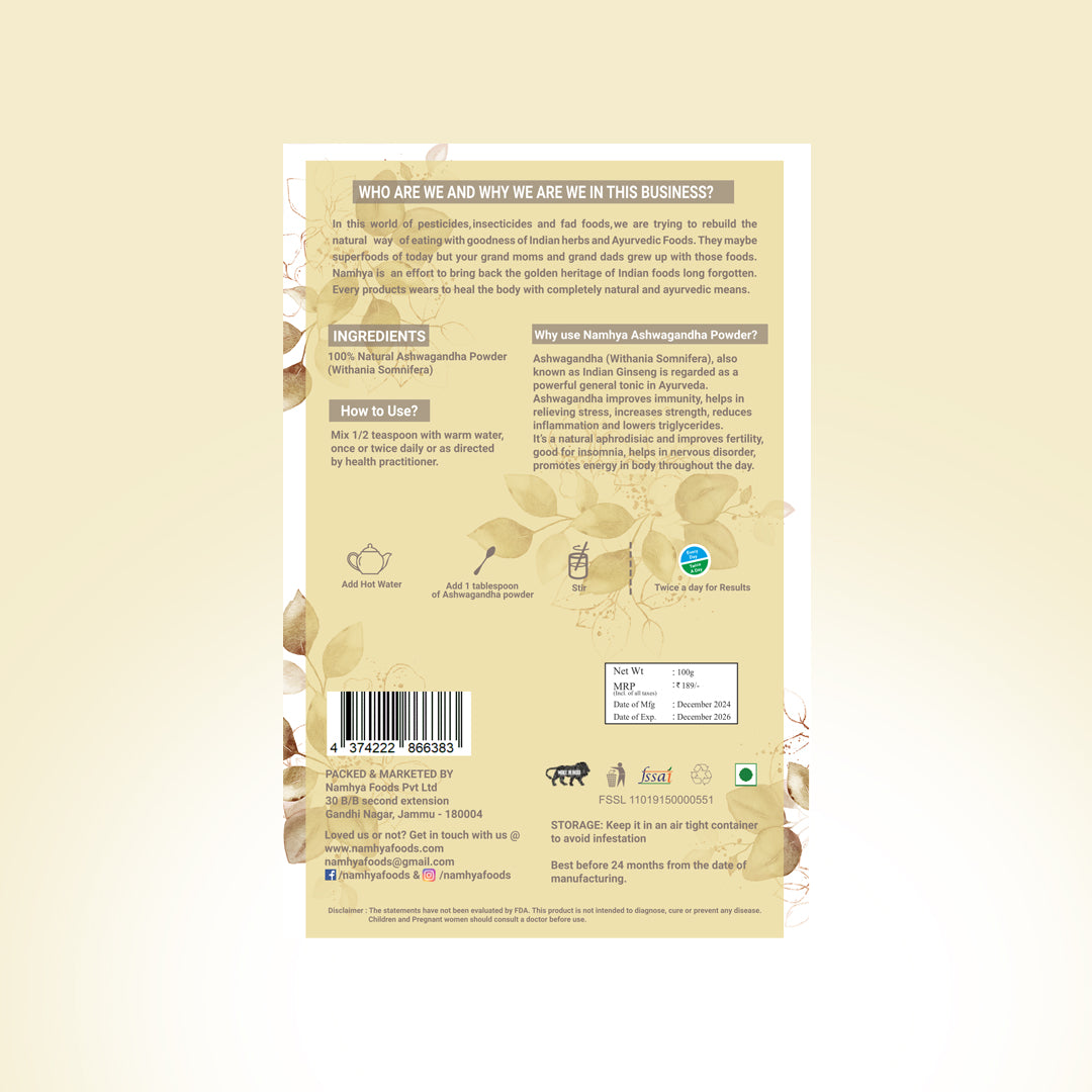 Ashwagandha improves immunity, helps in relieving stress, increases strength, reduces inflammation and lowers triglycerides. It's a natural aphrodisiac and improves fertility, good for insomnia, helps in nervous disorder, promotes energy in body throughout the day